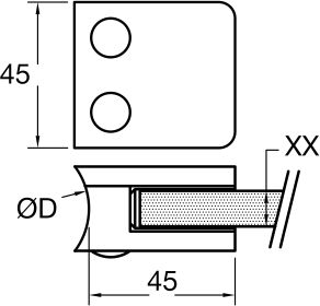 Glass Clip – Small Square with Safety Pin Size 45x45 mm, designed for flat surface mounting. Made of ZAMAK in satin finish. Suitable for glass thickness 6 to 10.76 mm. Includes safety pin for added security.